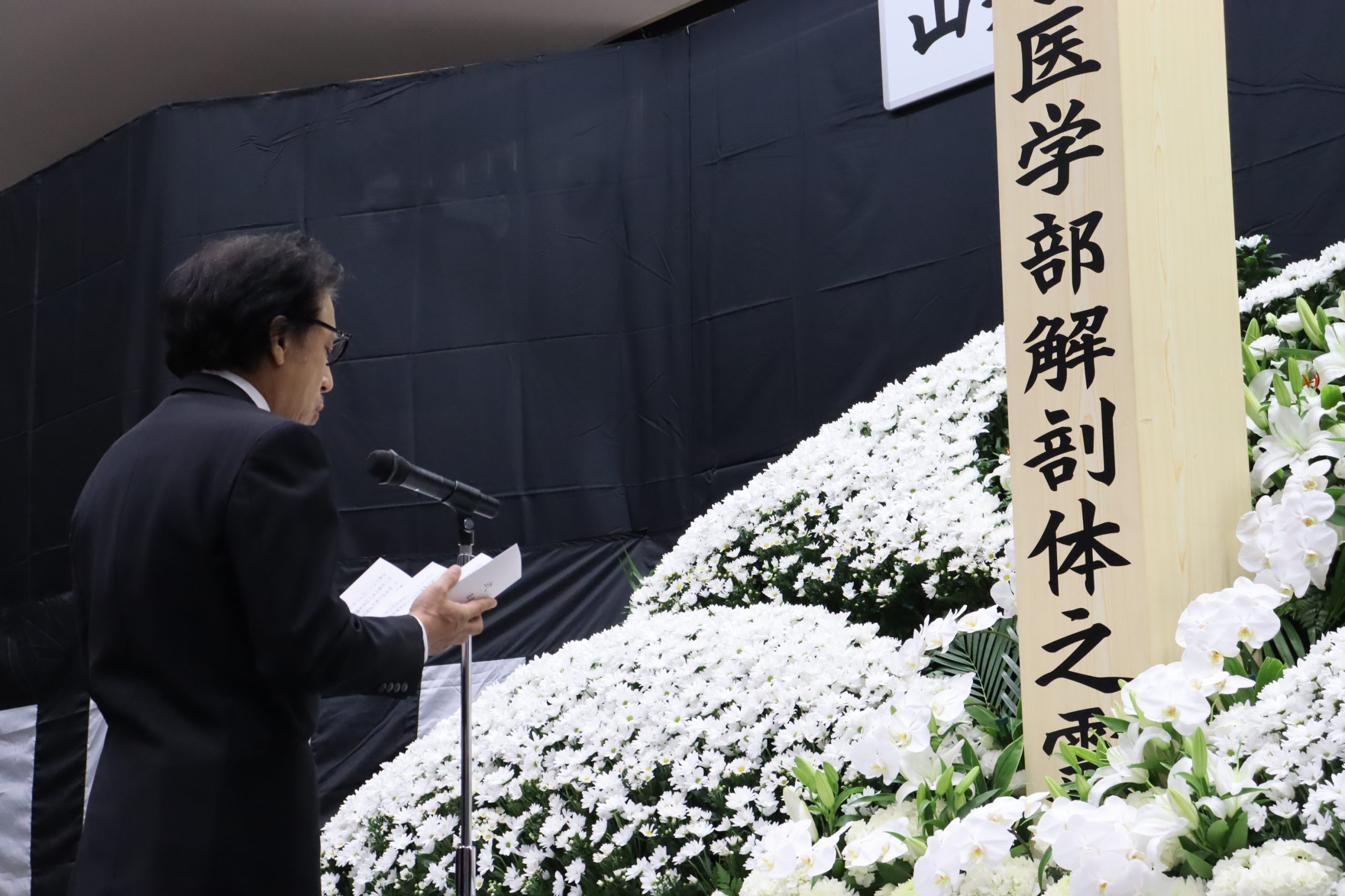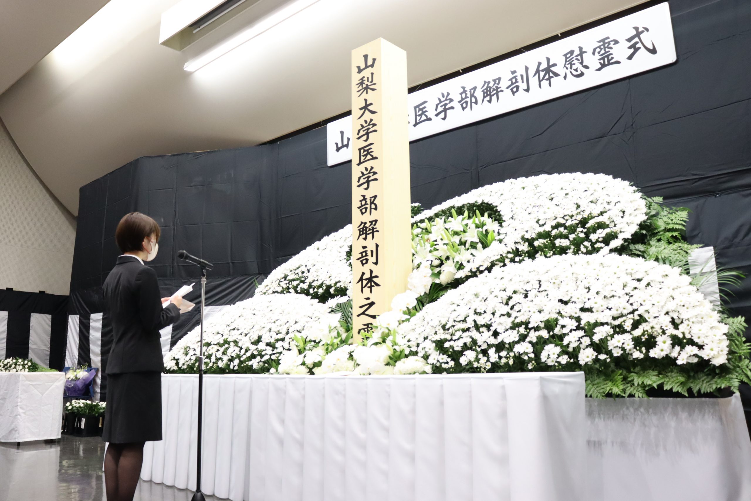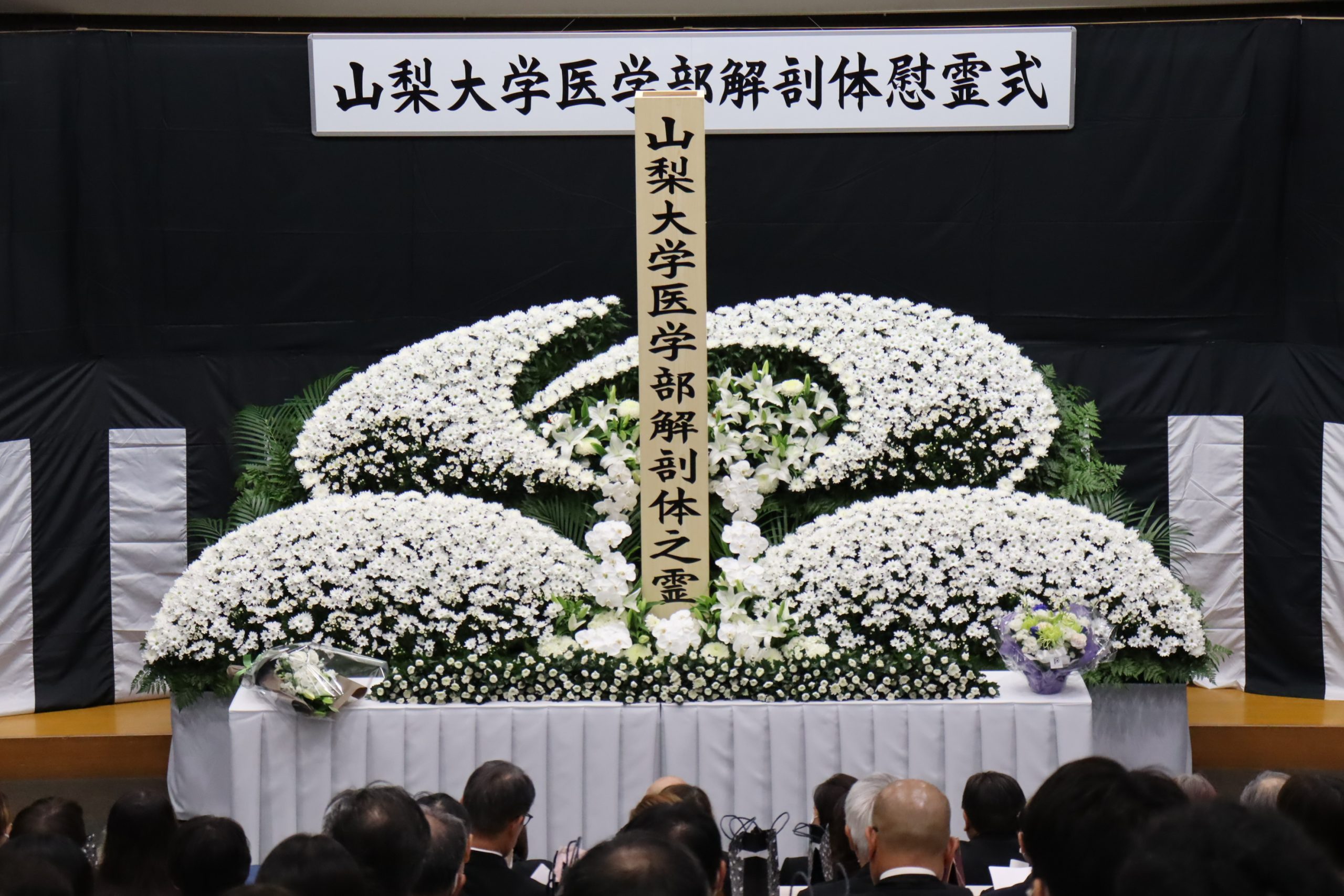 本学医学部では、解剖学実習や医学研究等のためにご献体いただいた御霊の御冥福を祈念し、毎年慰霊式を挙行しており、ご遺族への謝意を表すとともに、医学部学生にご献体に対する感謝や責任を自覚させる教育を行っています。