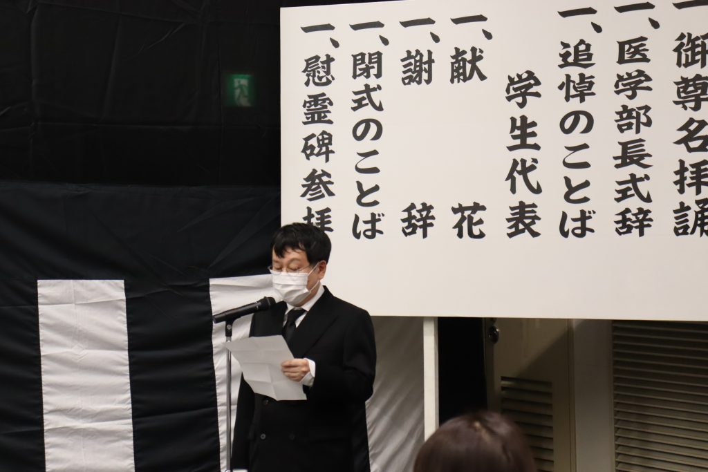 その後、出席者全員で献花を行い、最後に篠原良章教授(解剖学講座システム生物学教室)がご遺族に対し謝辞を述べました。