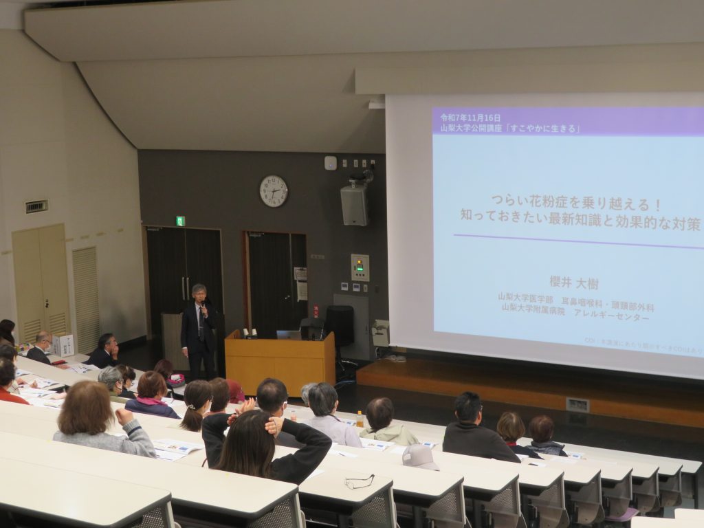 また、櫻井大樹 教授(耳鼻咽喉科・頭頸部外科学講座)が、最近子どもから大人まで急増している花粉症について、山梨県は花粉症の有病率が全国で最も高いことを踏まえ、対処法や新しい治療法についてわかりやすく解説しました。