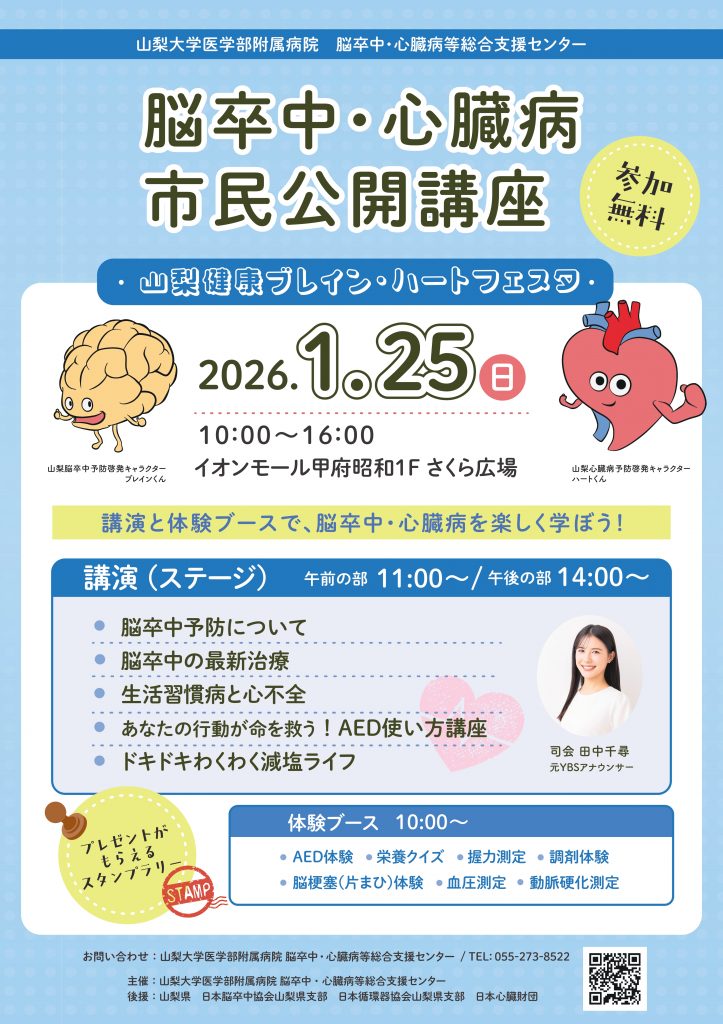 脳卒中・心臓病等総合支援センター主催で「脳卒中・心臓病市民公開講座~山梨健康ブレイン・ハートフェスタ~」を開催します。 参加費無料で、どなたでもご参加いただけます。 脳卒中や心臓病に関する講演だけでなく、各種体験ブースも企画しておりますので、ぜひお越しくださいませ。一緒に楽しく学びましょう。 記 日時:2026年1月25日(日)10時~16時 会場:イオンモール甲府昭和1F さくら広場 詳しくは、下記チラシをご覧ください。