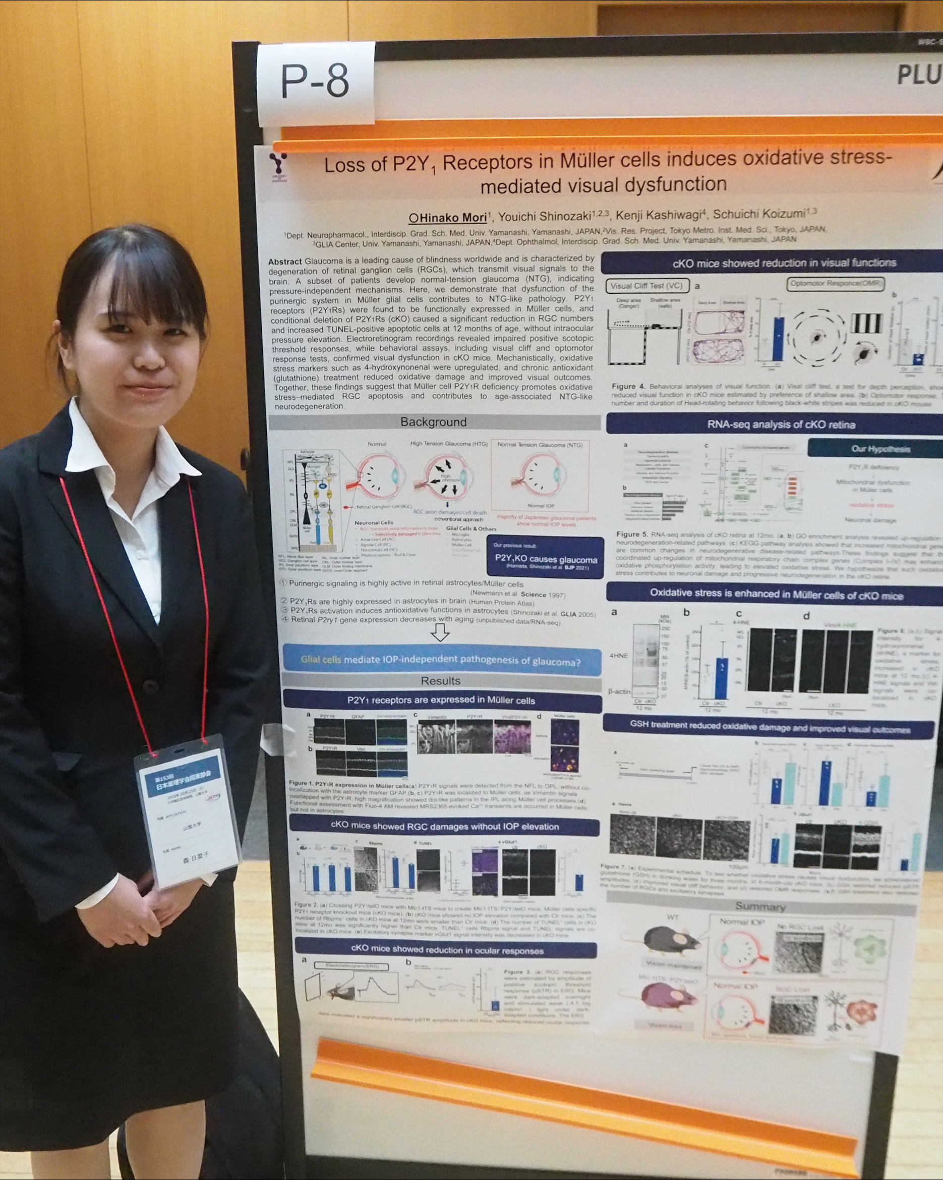2025年10月25日に行われた第153回薬理学会関東部会に参加させていただきました。そこで「Loss of P2Y1 receptors in Müller cells induces oxidative stress-mediated visual dysfunction (ミューラー細胞のP2Y1受容体欠損は酸化ストレス依存的な視機能障害を誘導する)」というタイトルでポスター発表させていただきました。