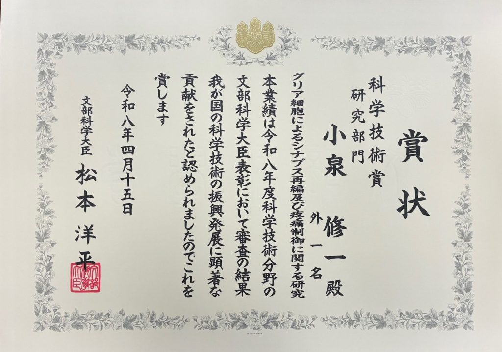 受賞した小泉教授は、「今回の受賞は、30年以上にわたりグリア研究に共に取り組んできた研究室メンバー、学生の皆さん、そして学外の共同研究者の方々のご尽力の賜物であり、皆さんを代表して頂いたものと受け止めております。本研究により、グリア細胞がシナプスおよび神経ネットワークの再編という、脳の中核的機能の制御において中心的な役割を担うことが明らかとなりました。今後は、慢性痛にとどまらず、さまざまな脳疾患や発達期における神経ネットワーク形成の解明へと研究を発展させていきたいと考えております。」とコメントしています。
