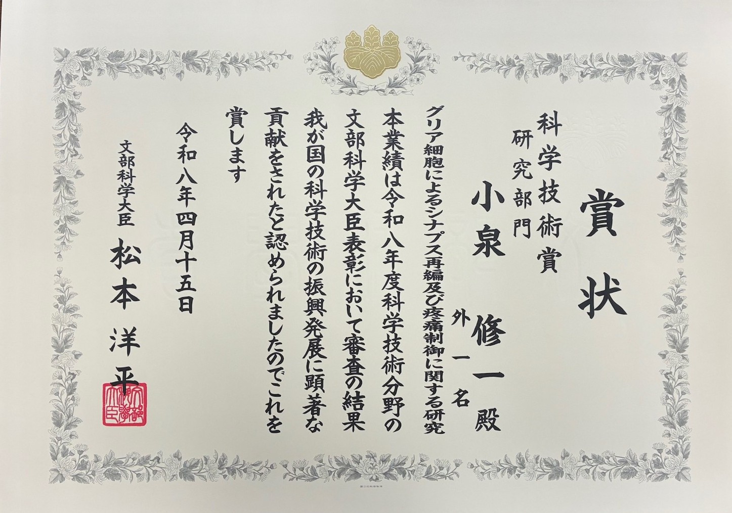 令和8年4月15日(水)、小泉修一 医学域長(薬理学講座教授)が令和8年度科学技術分野の文部科学大臣表彰科学技術賞(研究部門)を受賞し、文部科学省において表彰式が行われました。